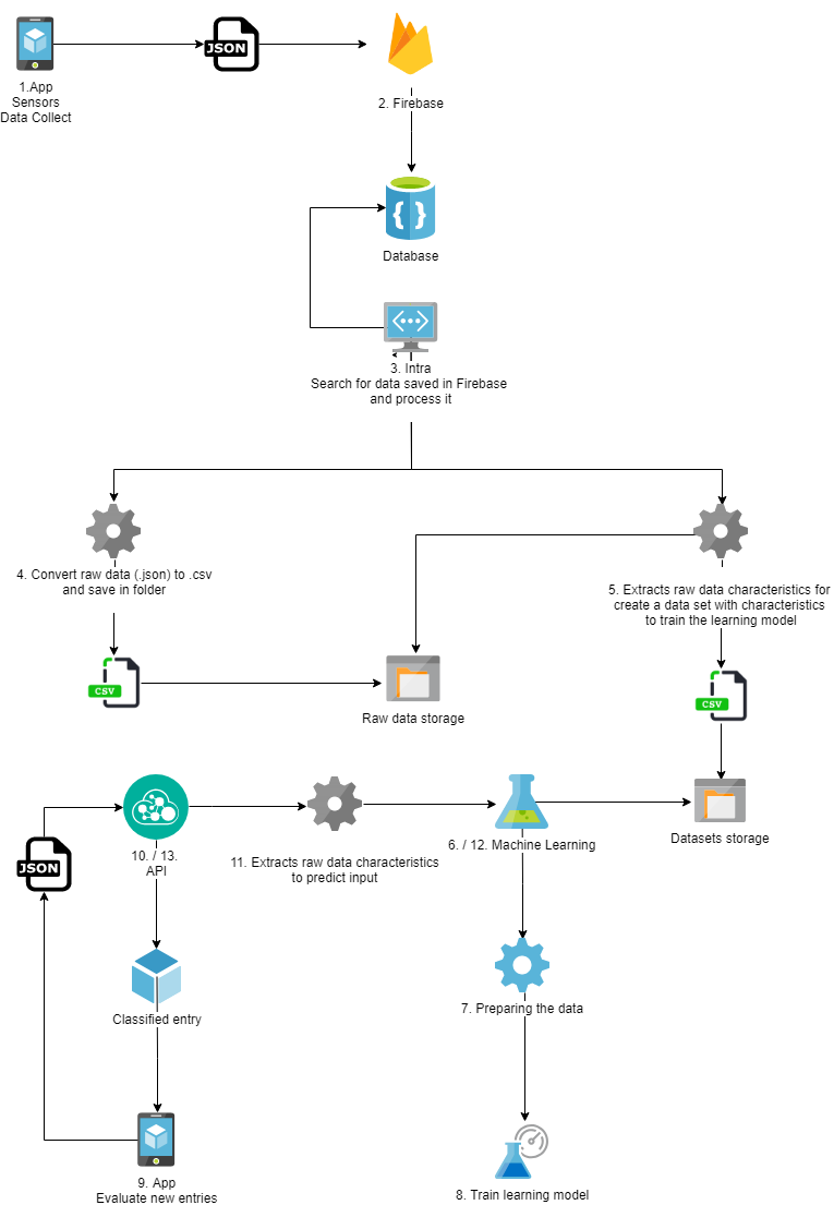 App-mobile: It collects the data according to the movement that the user has informed by a selector of movements, then it clicks to execute the application to begin to monitor the movements, and when the movement finishes, it stops clicking and the data is sent to the Firebase automatic. The application also implements a way to evaluate the machine learning model that has been trained. The user clicks run, makes the move. To see the answer, he clicks to stop when he finishes making the move. When Stop is clicked, the template will respond to what movement has been made. If it hits, the user marks as True Positive, if not, it marks as False Positive