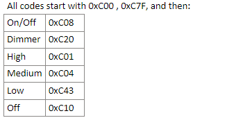 Hence, the (on/off) sequence above is: 1100 0000 0000 = 0xC00 , 1100 0111 1111 = 0xC7F, 1100 0000 1000 = 0xC08 ; each 12 bits. The last command is repeated 3 (+) times.