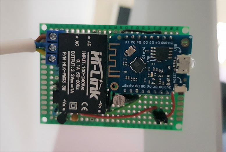 On the PCB you may have noticed a photoresistor that was not in the schematics. The photoresistor is serially wired to a 10K resistor (between gnd and vcc) and connected to Wemos A0, an analog input. This is because I wanted to find out if I can detect if the light is (already) on or off. However, that does not work, the daylight interferes way to much with the light.
