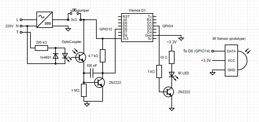 The approach I took: a small box with an esp8266 (Wemos D1 mini), IR LED, and optocoupled 220V detection. I used the IRremoteESP8266 library to analyse and send signals.
